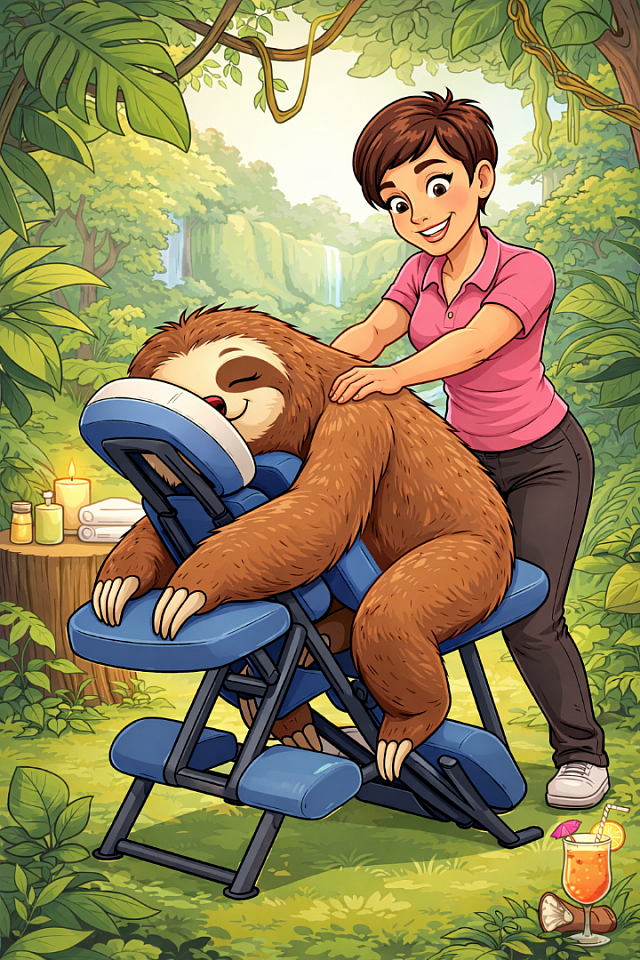 Met de luiaard als inspiratie geef ik stoelmassages bij je thuis of op locatie.
