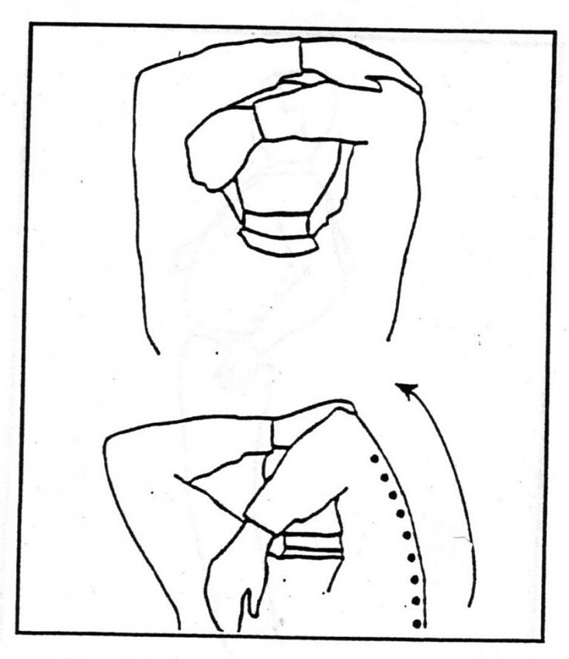 Steek je linkerarm achter je hoofd en pak met je hand je nek vast. Kneed daarna met je vingers je nek, van boven bij je hoofd tot aan je sleutelbeen. Na een minuutje kun je hetzelfde doen met je rechterarm.